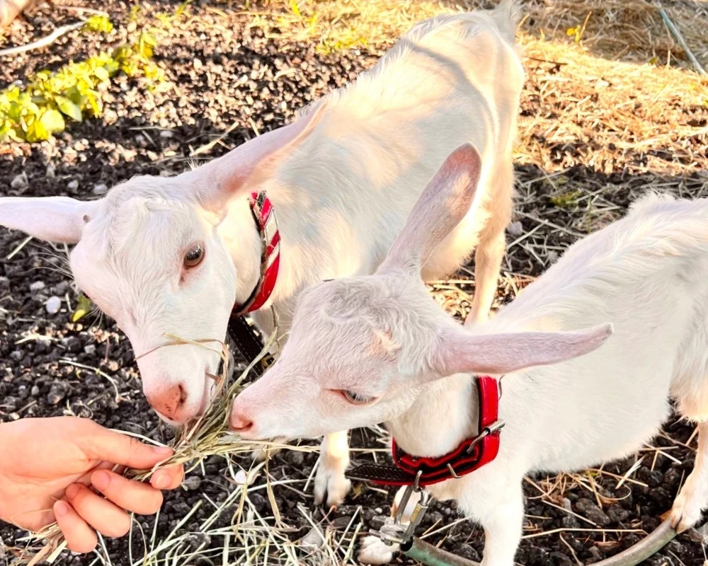 猫は敷地内を自由に暮らしており、他にも犬だけでなく、ヤギなどの動物とも触れ合えますよ!